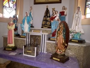Na bela Igreja Matriz de Tapera (RS), à direita do altar e do local onde o pessoal dos cantos se coloca, tem um altar dedicado à Virgem Maria. E lá tem nove imagens dela: Aparecida – minha protetora; Fátima, Salete, das Graças, Guadalupe, Desatadora de Nós, da Saúde, Auxiliadora e a padroeira do município, do Rosário da Pompeia.